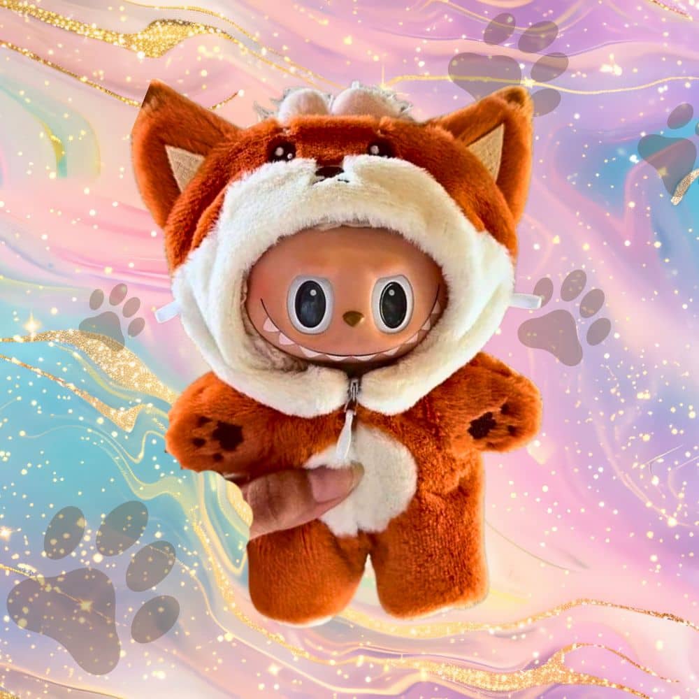 Adorable fox cosplay outfit for 17 cm Labubu dolls. Soft plush material with zip closure and paw details. (Only clothes, doll not included.)