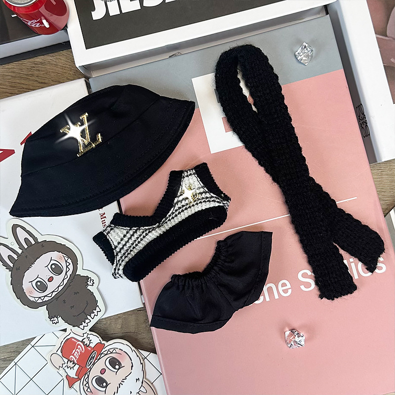 This Labubu confidently embraces streetwear style! Dressed in wide black trousers, an elegant striped jumper, and topped with a black bucket hat adorned with a golden Louis Vuitton emblem, it exudes urban fashion flair. A stylish black scarf completes this bold look, perfect for fans of contemporary, trendy, and distinctive design. A must-have for collectors seeking originality and character.