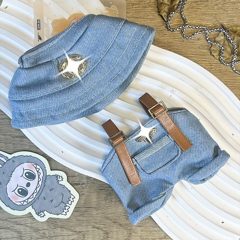 Labubu embraces a cosy and effortlessly stylish look with this chilled denim ensemble, blending urban charm with a soft, refined touch. Featuring a plush white hoodie and light blue dungarees with camel straps and vintage golden accents, this outfit offers the perfect balance of comfort and street-inspired flair.